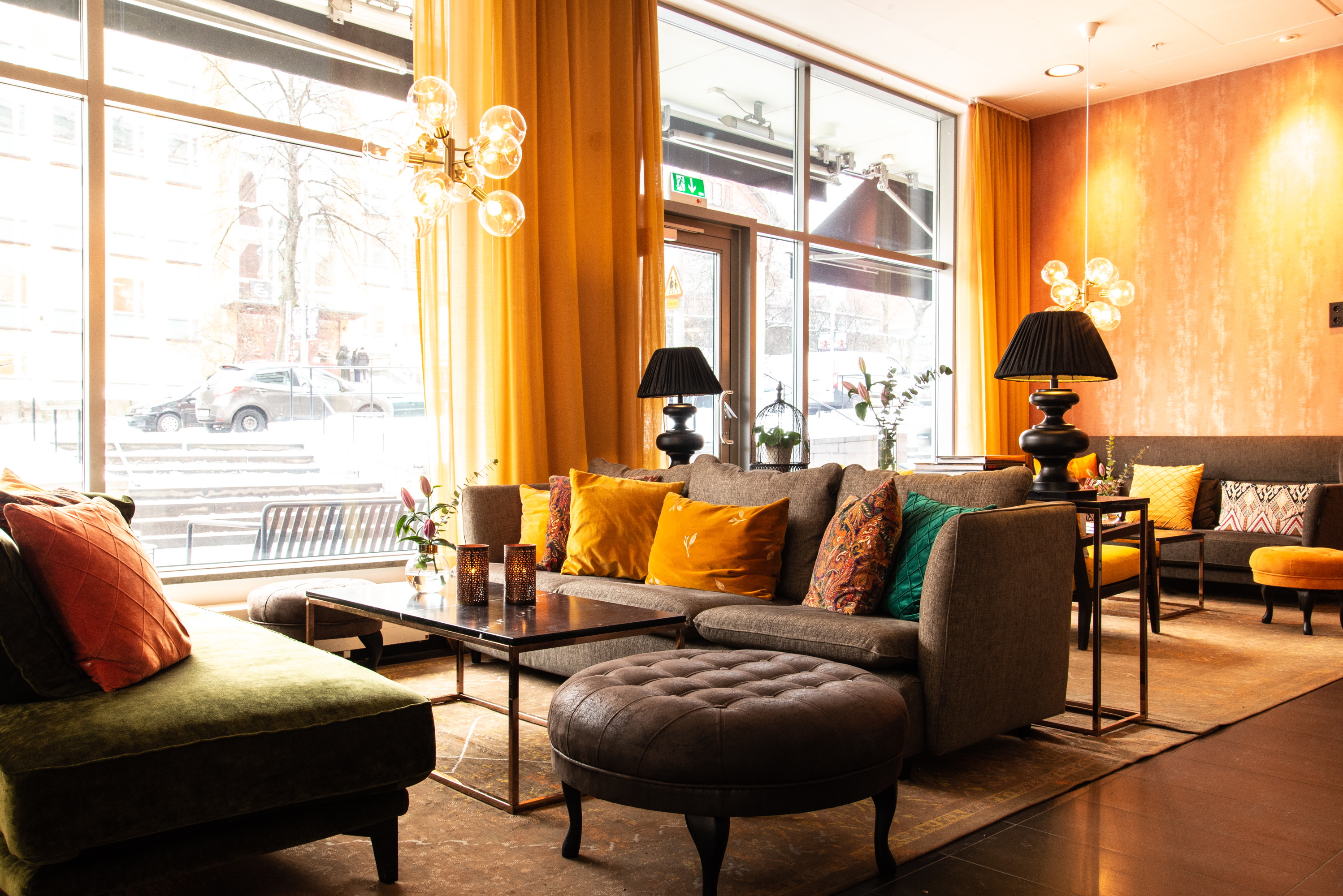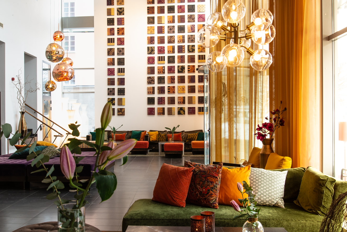Our lounge has become Time Hotel's stand- out signature, with its discreet yet distinctive dedication to the owner’s family's roots in India and Asia. You’ll notice it in the color range of furniture and accessories, but most of all in the five- meter- tall artwork in the center of the room, consisting of 60 smaller paintings with designs inspired by Indian saris, interpreted by artist Ninni Ahlsell.